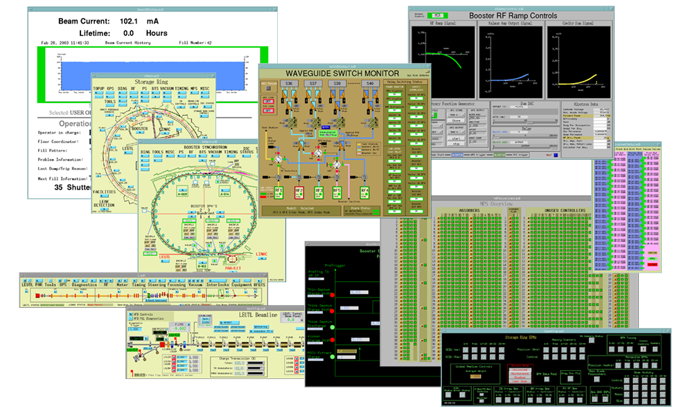 He was the principal liaison between the Controls group at the APS and the Physics group, and in 1997 was transferred to that group. There he became involved with the Experimental Physics and Industrial Control System (EPICS), which was being developed in collaboration with Los Alamos and what would become a large world-wide consortium. EPICS was considered to be the leading industrial control system in the word in those years and is used in many large experiments, such as particle accelerators and telescopes. He became one of the principal developers for EPICS. He was responsible for the Motif Editor and Display Manager (MEDM), which is the principal user interface for controlling and monitoring the thousands of instruments that make up a facility such as the APS. It is used by nearly everyone, from physicists and engineers to management. The televisions you see around the site and the ring are running MEDM. If you go to the control room, you will see MEDM on almost all the computer screens, and you will see it running at the beam lines and in offices throughout the facility. It was new software technology at the time it was written, and although it is now old technology, it is still in widespread use. At the APS alone there are tens of thousands of control screens, like the examples below, which are both created in MEDM in its edit mode and run by it in its execute mode.
